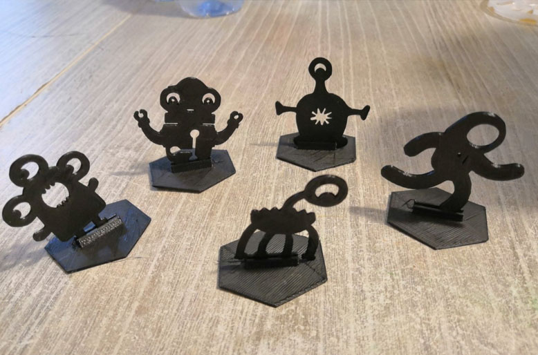 Dès et pions de jeu de société imprimés en 3D.