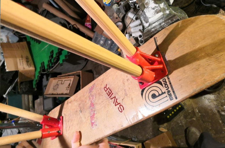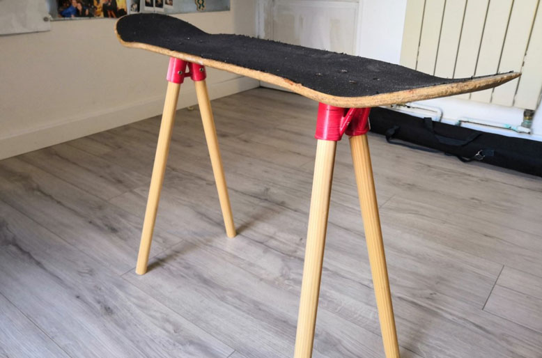 Tabouret Skateboard avec des pied à base de manche à balai.